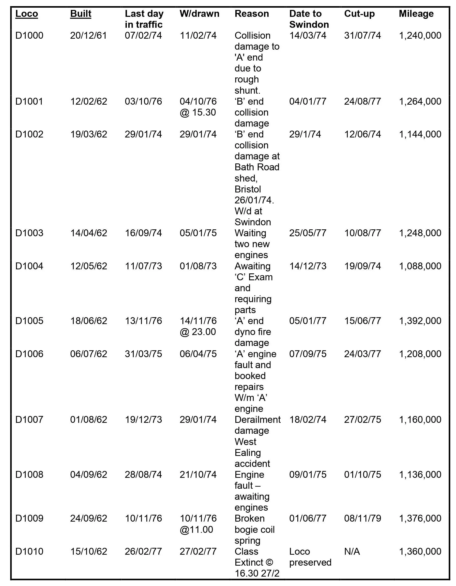 SWINDON BUILT LOCOMOTIVES AT A GLANCE BUILD AND WITHDRAWAL NOTES